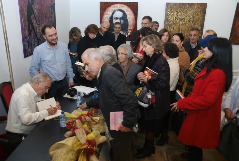 Zambujal ladeado pela representante da editora e Carlos Nuno Granja
