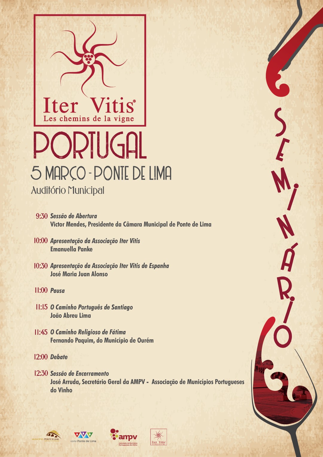 O programa conta com a presença de Emanuella Panke, Secretária Geral da Iter Vitis, de José Maria Juan Alonso, da Iter Vitis Espanha, de José Arruda, Secretário-geral da Associação de Municípios Portugueses do Vinho e de outras individualidades que abordarão o Caminho de Português de Santiago e o Caminho Religioso de Fátima.