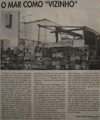Em 27 de fevereiro de 1996, lia-se no Jornal de Noticias (Página do Leitor), que, “o drama social e habitacional das cerca de duas dezenas de famílias que habitam no inabitável bairro do SAAL, na praia de Cortegaça, na sua generalidade em ruinas. Já não esperam por promessas caducadas no tempo (…)” e ainda, “tudo continua com tendência a piorar, devido ao tipo de construção deste quase «bairro fantasma», que nasceu cheio de contradições e mistérios e pela indiferença de que continua a ser vítima”. Também era afirmado neste texto, que, “o mais grave deste drama que tem servido de arma de arremesso, entre autarcas de Ovar, é ainda o peso da burocracia sobrepor-se a uma urgente e imperiosa ação, mais de carácter humanista e social (…)”.