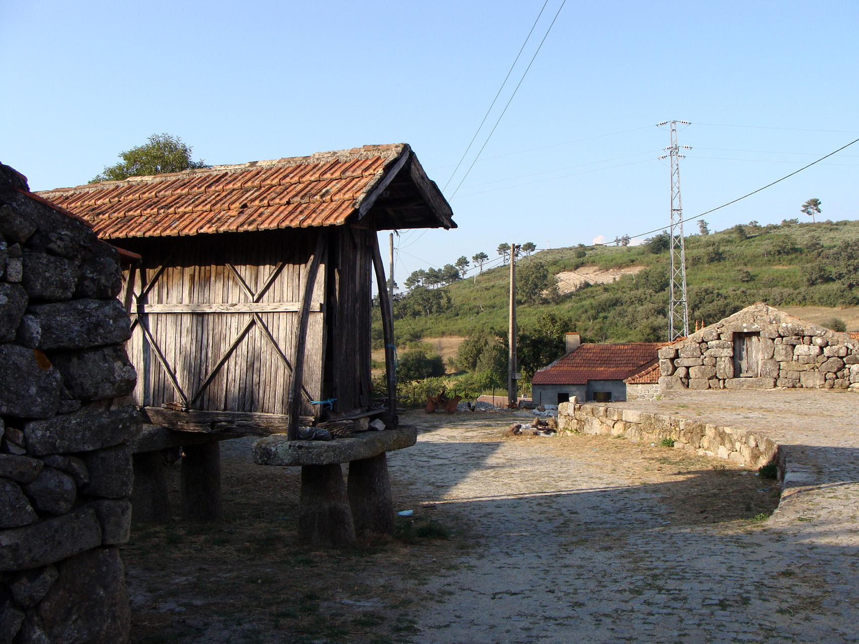 Casas, muitas casas em pedra com as suas eiras de secagem dos cereais onde os canastros do milho, ativos ou não, são de predomínio constante nestas paragens.