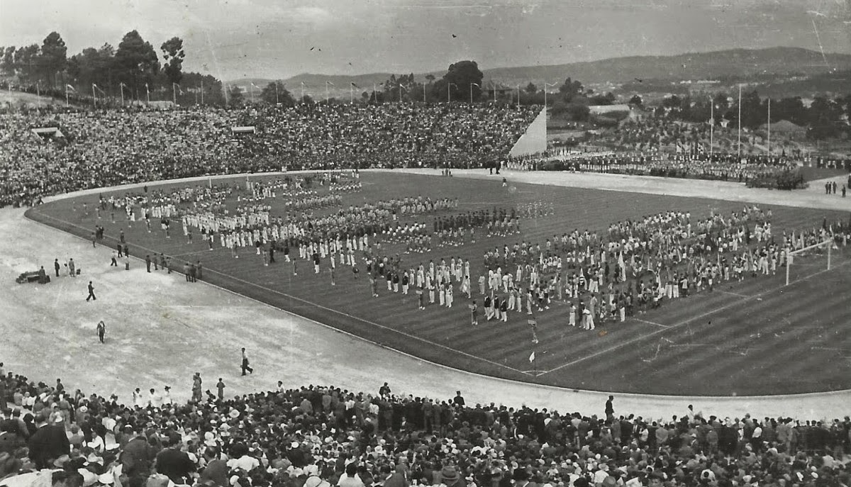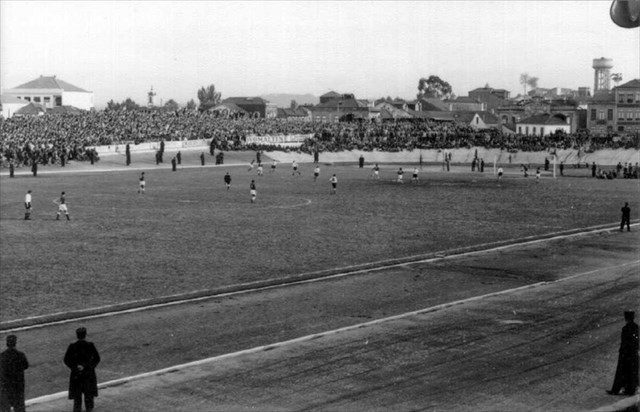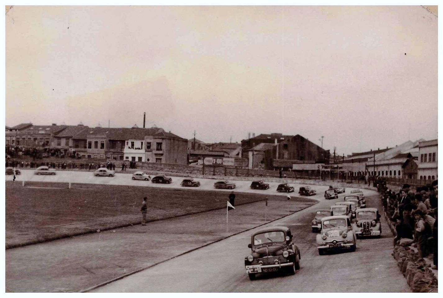 O campo de futebol tinha à sua volta duas pistas: uma de atletismo (a cinza) e outra para ciclismo e automobilismo (a cimento)