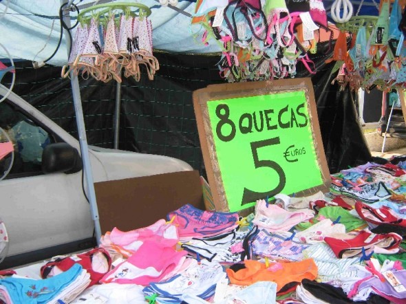 Os escritos dos vendedores ambulantes, são uma fonte de imaginação, para vender a mercadoria, mas também um motivo para alegrar os nossos passeios. Por exemplo, nos tempos que correm, ninguém espera oito “quecas”, pelo preço de 5 €! Mas, a verdade, é que um anúncio destes, atraente, foi visto por um “maduro”, que nos deixou esta engraçada imagem. Claro que, passado o impacto hilariante, chega-se à conclusão que os 5 € são o custo de oito “cuecas”.