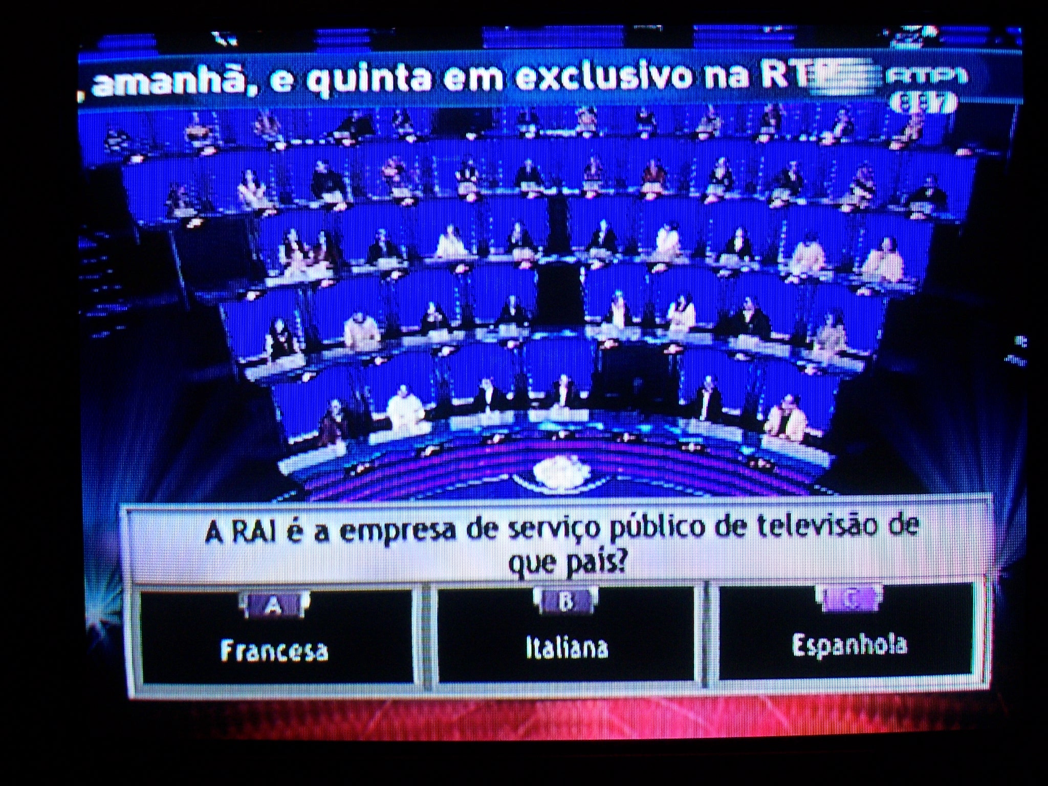 A Língua Portuguesa continua a ser, continuamente, massacrada nos programas televisivos. São pontapés na gramática, uns a seguir a outros. Quem estiver atento à linguagem usada nas intervenções na TV, pode detectar, ao longo das emissões, dezenas ou, até, centenas de calinadas, tanto de forma, como oralidade e de escrita, como nas legendas dos rodapés. Um bom exemplo disso, é esta imagem de um concurso cultural da RTP. Neste caso, mistura-se países com nacionalidades: Francesa, em vez de França; Italiana, em vez de Itália; e Espanhola, em vez de Espanha. Ora vejam: