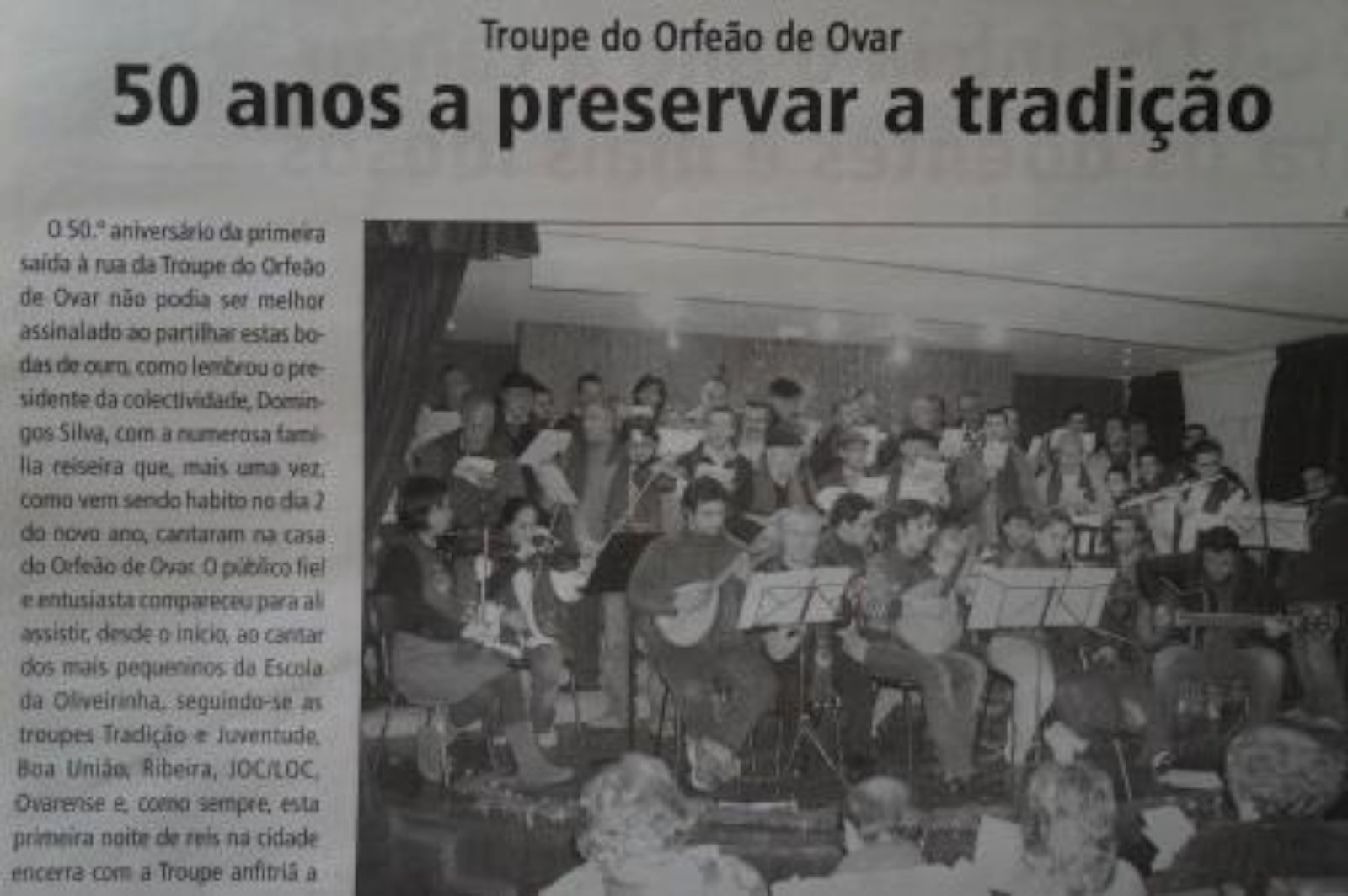 Nesta centenária tradição a Troupe de Reis do Orfeão de Ovar assinalou em 2007 meio século, “50 anos a preservar a tradição” (J.O., 04/01/2007), enquanto a da Ribeira mantem ainda hoje a “Tradição reiseira no feminino” (J.O., 04/01/2007).
