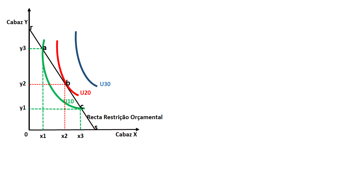 No mesmo gráfico está desenhada uma reta (r,s) que simboliza a Recta de Restrição Orçamental (ou Recta de Balanço) do consumidor racional. Que gastará em dois cabazes de bens (Y e X). Nas extremidades dessa recta temos os pontos r e s que são pontos de intersecção com os eixos Y e X, respetivamente. No ponto r o consumidor aplicará todo o seu rendimento em quantidades do Cabaz Y e zero do Cabaz X. Já o contrário acontece no ponto s. Note-se, porém, que qualquer um destes pontos não responde aos anseios do consumidor racional. Pois as suas curvas de indiferença prefenciais são U10, U20 e U30. Nem r nem s tangem ou mesmo cruzam qualquer uma delas.
