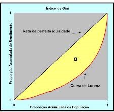 A área a amarelo entre a Curva de Lorenz assinalada e a linha que parte da origem dos eixos e divide a meio o quadrante é a citada zona de distribuição da riqueza. Quanto maior for essa zona (área) maior a desigualdade na sua distribuição. Quanto mais a Curva de Lorenz se aproximar da “reta de perfeita igualdade” menor é a desigualdade. A um ponto qualquer da linha da reta corresponde igual percentagem acumulada de população e de riqueza. O Coeficiente (Percentagem) de Gini assume valores entre 0%-100%. Assim há menor ou maior desiguldade na distribuição de riqueza quanto mais baixa ou mais alta for a percentagem.