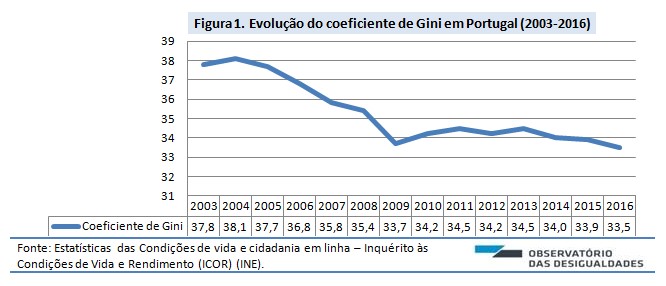 Neste gráfico constata-se que o Coeficiente de Gini para Portugal partindo de um pico de 38,1% em 2004, foi descendo sustentadamente até 2009 (33,7%). Neste ano inverteu-se a tendência e só atinge um valor abaixo do de 2009 em 2016 (33,5%). Pergunta-se: qual a razão para os movimentes oscilantes entre 2009 e 2013? E depois deste ano, de novo a queda? Não será isto consequência das políticas governamentais?