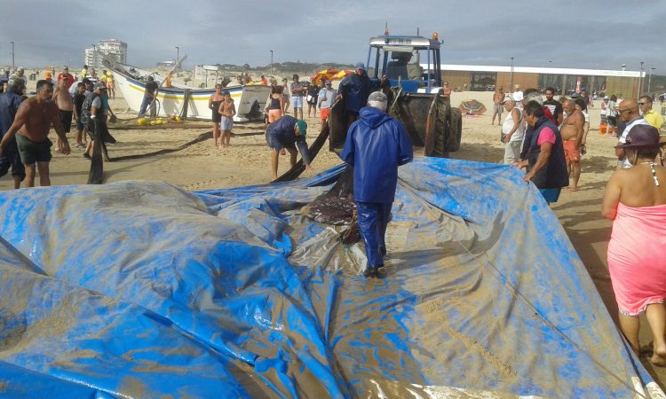 A inglória mostra do pescado resultante de mais esta ida ao mar do barco “Canope” ao fim de um dia bem mais reconfortante para os banhistas, que “disputam” o areal com a habitual azáfama das várias fases desta atividade piscatória. Desde a entrada no mar à chegada a terra da característica embarcação adaptada ao tipo de mar na Costa de Caparica, e as operações que se seguem, do puxar das redes através do sistema mecânico dos tratores, que logo a seguir e de forma manual, as cordas vão sendo recolhidas diretamente no barco, para nova ida ao mar no dia seguinte. Também pelas mãos de homens e mulheres desta arte, vão orientando as “paredes” das redes de “cerco”, que, encaminham o peixe possível para o interior e o fundo do saco, em que os olhos de pescadores e curiosos na praia, estão fixos na expetativa do pescado que em terra é medido e pesado por técnicos antes da venda.