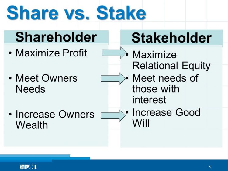 A partir dos anos 80 e tendo como origem reflexiva os fundamentos da ética e responsabilidade empresarial, os académicos ousaram propor a passagem do paradigma shrareholders para o de stakeholders. A empresa/organização deveria assumir um papel central na realização holistica da sua existência. O escopo da sua atividade não poderia ser mais única e exclusivamente o lucro que os seus proprietários desejam arrecadar. Quanto mais mais.