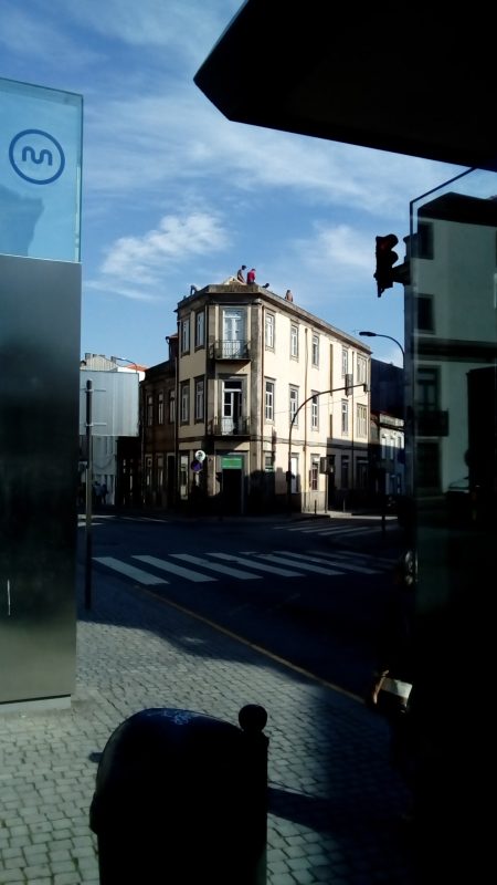 Para quem quisesse ver, e logo na cada vez mais central Rua do Heroísmo (esquina com a Rua do Barão de Nova Sintra, a dois passos da estação do Metro), meia dezena de trabalhadores encontrava-se a laborar sem qualquer tipo de segurança, e a uma altura digna de registo.