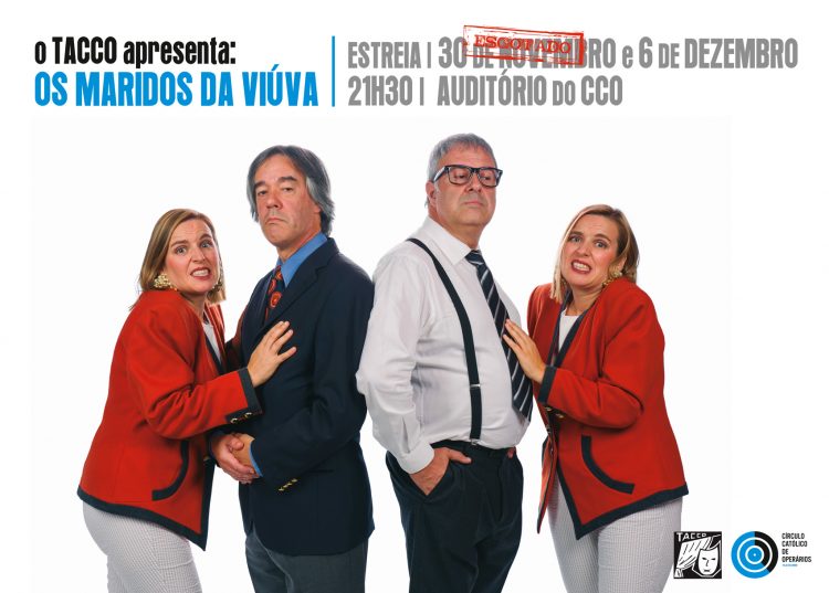 O TACCO – grupo de Teatro Amador do Círculo Católico de Operários (CCO) encerrou a 4.ª edição do FesTacco com a estreia da peça “Os Maridos da Viúva”, no no dia de ontem (30nov19), no CCO. Mas, devido à elevada procura por parte do público, foi aberta uma nova sessão que terá lugar também no Auditório do CCO, no dia 6 de dezembro, sexta-feira, pelas 21h30.