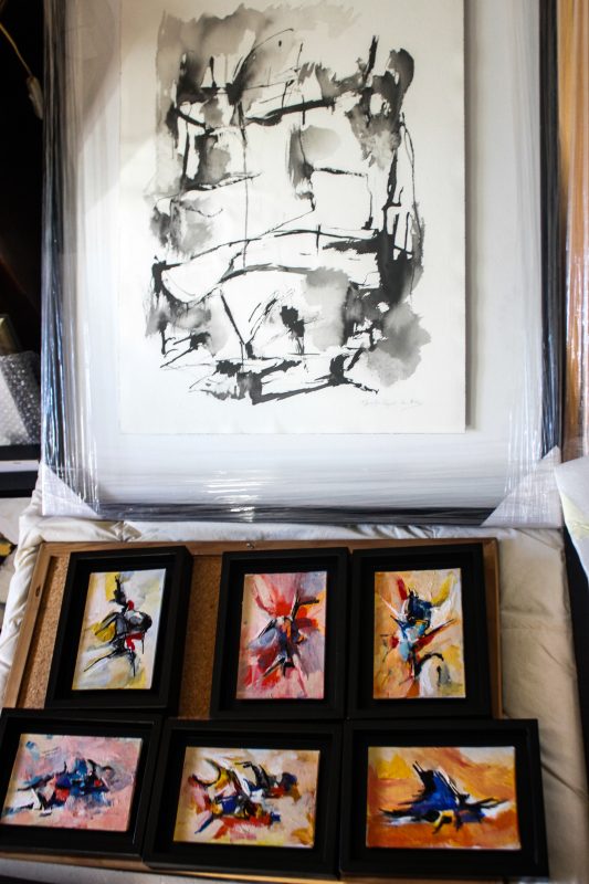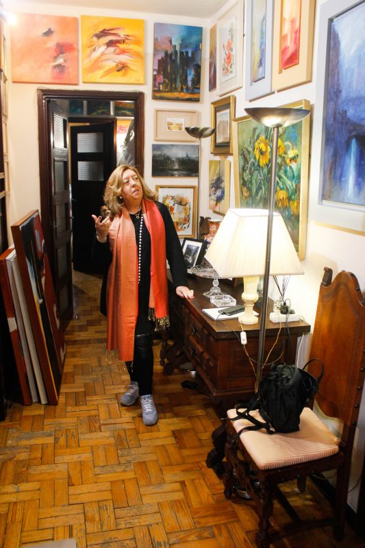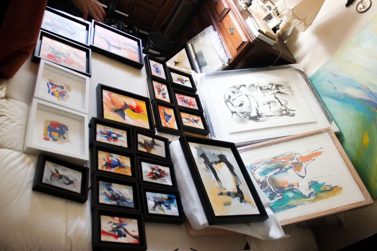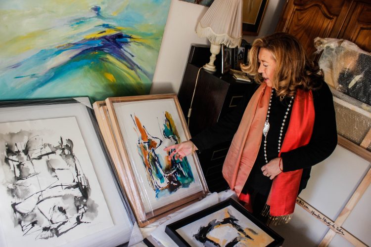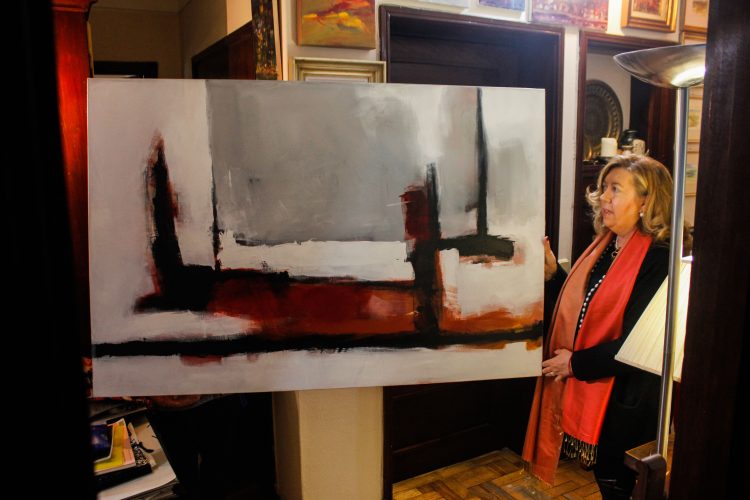 “Todos os quadros têm a sua história, quando o meu marido faleceu, aquilo que senti foram cinco anos de luta dele e ele sempre a trabalhar. Com a morte dele parei um bocado para reflexão, meditação, e quando regressei à pintura, surgiram os pretos, os vermelhos, um conflito de cores, há uma revolta… um conflito interior e que vai tudo para a tela.