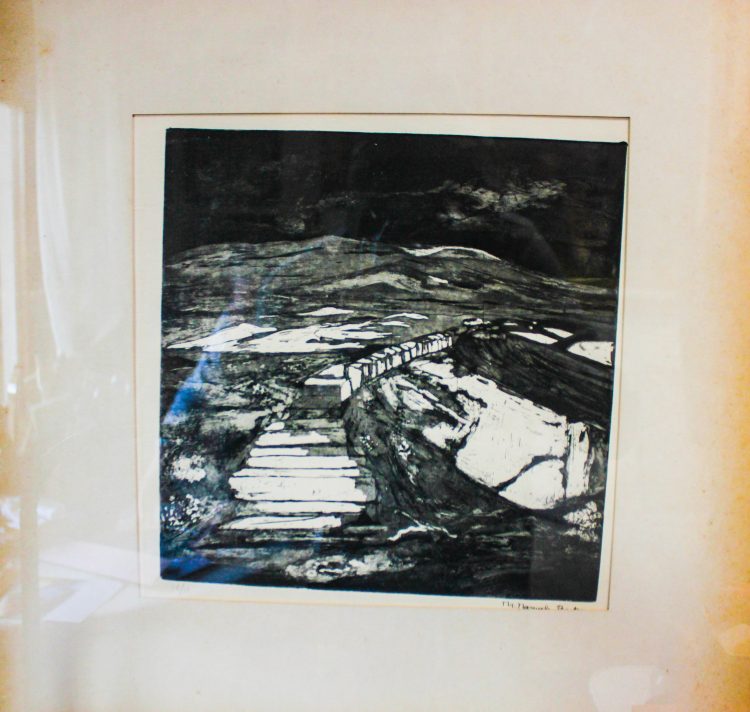 Em relação aos outros mestres. Armando Alves, também já esteve aqui no meu ateliê, foi meu professor de Artes Gráficas, para fazer catálogos, cartazes… que também tive nas Belas-Artes. Já estava mais solta, mais gestual. Tive boa nota. Correu bem. Ele gostou bastante do que viu. Gora já tenho muito mais. Também gostou dos catálogos que o Luís, o meu filho, fez quando estava cá. Era ele que organizava a parte gráfica. Fez-me um livro e uns catálogos. Armando Alves ao ver disse que eu tinha um luxo em casa, é para ver a qualidade do meu filho!”