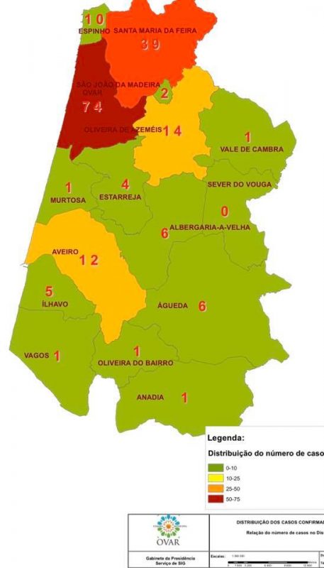 (18:17) – “O número de confirmados em Portugal hoje subiu 25%. Em Ovar subiu apenas 12,5%. Por outro lado as medidas musculadas implementadas estão a conter o vírus e a impedir que este contagie em larga escala o resto do distrito, como se vê na figura. O cerco está a funcionar. (…) Vou empenhar me fortemente para que o governo tenha uma discriminação positiva já junto dos munícipes de Ovar, com ajuda e apoios financeiros e para que apoie a sério as nossas indústrias que se viram obrigadas a encerrar perdendo milhões de euros… mas apenas aquelas que cumpriram escrupulosamente as regras!”