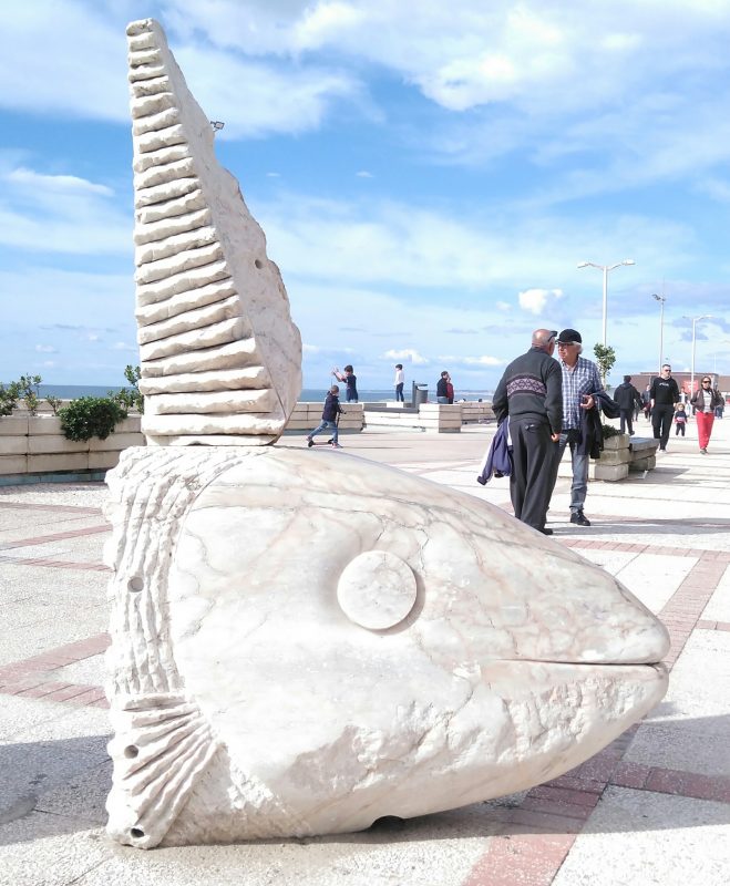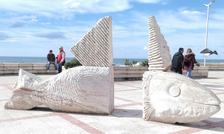 Não é do mar, apenas um peixe para o meu olhar. Peixe de pedra feito por homem cá da terra. O seu lugar não é o mar é o chão da calçada. Peixe de pedra a alma de gente vareira na luta incessante por uma vida à maneira.