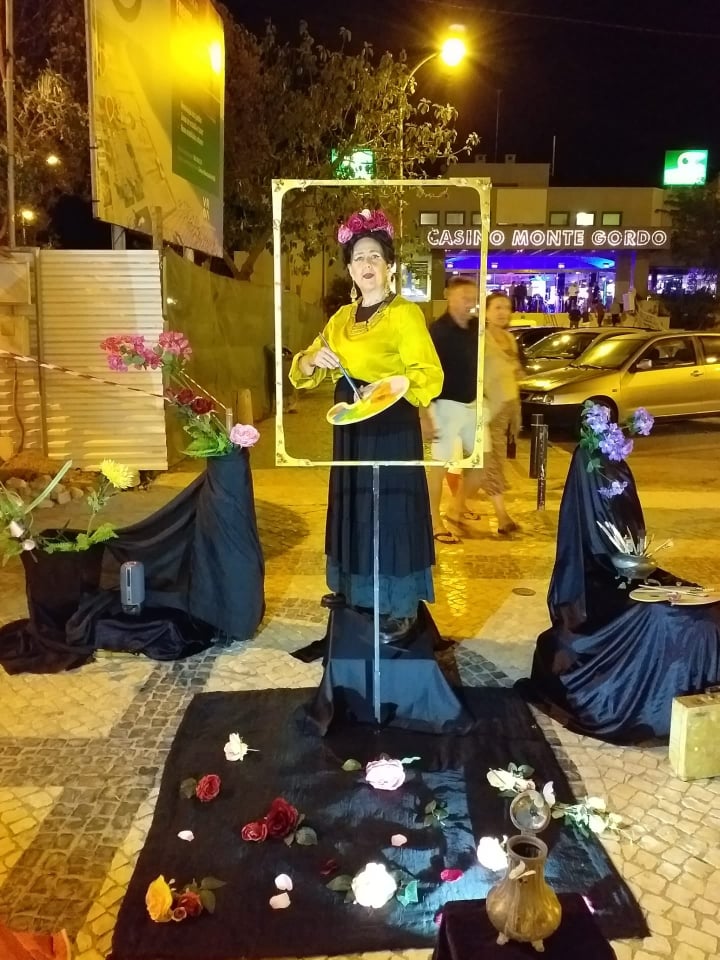 “Por quê Frida Kahlo?! Primeiro, porque pensei que não queria fazer uma «estátua de pedra», uma vez que já a havia em todo o lado. Queria que fosse algo de diferente, até porque não tinha maquilhagem para isso, e teria de ser algo que conseguisse fazer com curtos meios. Então, pensei: não posso fazer uma estátua, vou fazer um quadro, que também é estático. Depois pensei: quem é que vou fazer? A primeira que me lembrei foi van Gogh, mas não, e, então, veio á ideia uma das melhores pintoras do mundo, como é Frida Kahlo. Entretanto, também inventei um personagem masculino: um pirata. Gosto muito dele…tinha de fazer algo que viesse do mar, ou não me encontrasse em Monte Gordo”.
