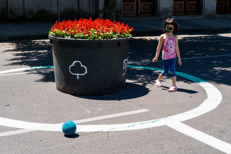Nas zonas pedonais temporárias há mobiliário urbano que, através das marcações coloridas no pavimento, cria zonas de estar, zonas de jardim e zonas de aparcamento para bicicletas.