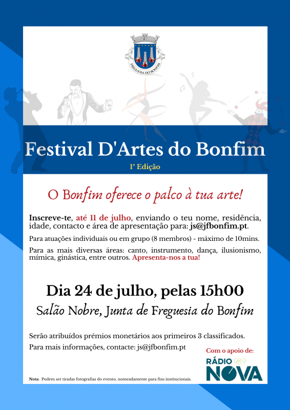 A Junta de Freguesia do Bonfim (JFB), através do seu pelouro da Cultura, realizará, no próximo dia 24 de julho, pelas 15 horas, no Salão Nobre da autarquia, a primeira edição do Festival d’Artes do Bonfim. Esta será uma iniciativa aberta ao público em geral e “sem limite de idades, pois toda a gente terá o palco à sua mercê para demonstrar aquilo que sabe”, como referiu ao “Etc e Tal”, José Soares, responsável pelo referido pelouro.