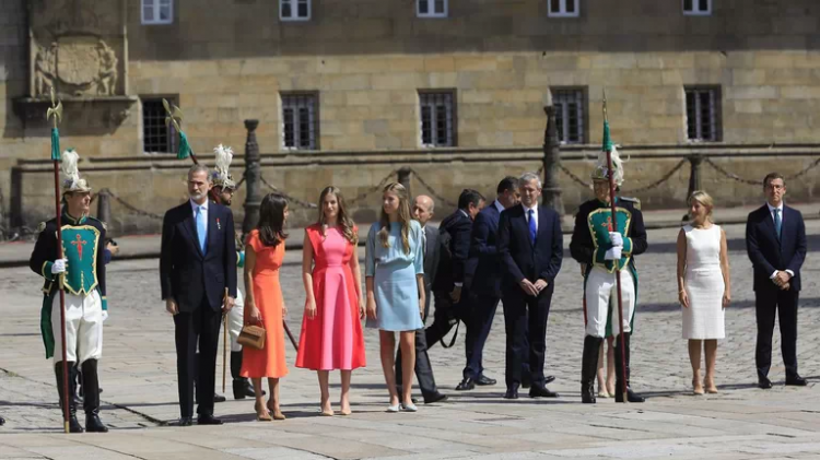 Os reis, acompanhados de suas filhas, chegaram à praza do Obradoiro, às 12h00, onde várias autoridades os esperavam, incluindo o presidente do Xunta, Alfonso Rueda, os vice-presidentes do governo central, Yolanda Díaz e Nadia Calviño, ou o presidente do Partido Popular, Alberto Núñez Feijo. A companhia de honras mistas, formada pelo Brilat de Pontevedra e infantaria e marinha de Ferrol, executou uma pequena parte do hino da Espanha e, em seguida, o rei revisou as tropas. Após cumprimentar as autoridades concentradas na Obradoiro, a delegação entrou na Catedral de Santiago através da escadaria principal e cercada pelos aplausos das centenas de cidadãos que puderam acessar esta praça.