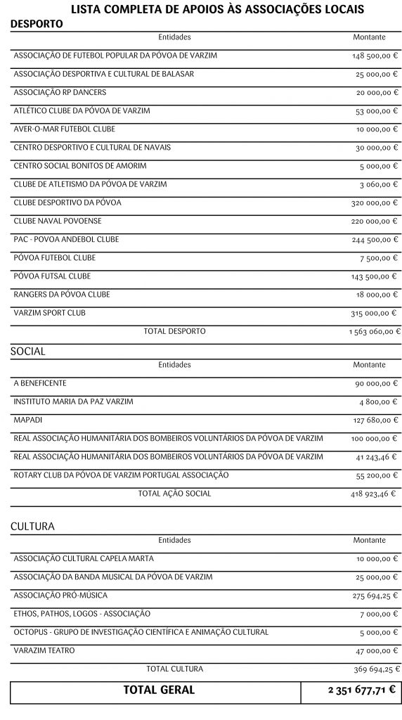 O presidente da Câmara Municipal da Póvoa de Varzim explicou que vão ser atribuídos, no total, mais de 2 milhões e 300 mil euros, um esforço significativo que o Município faz para apoiar o tecido associativo do nosso concelho.