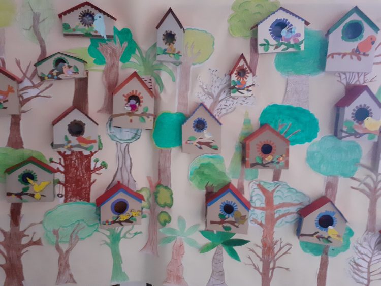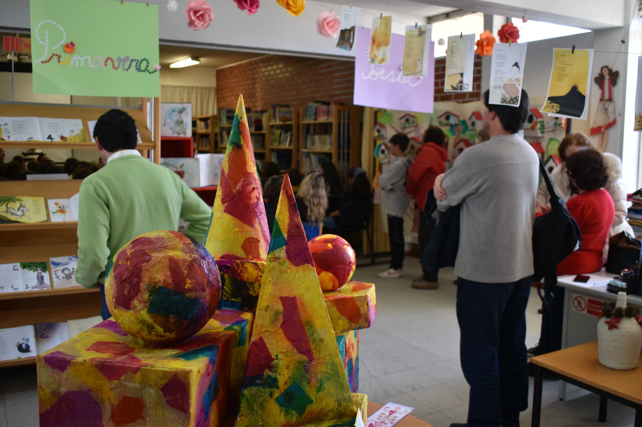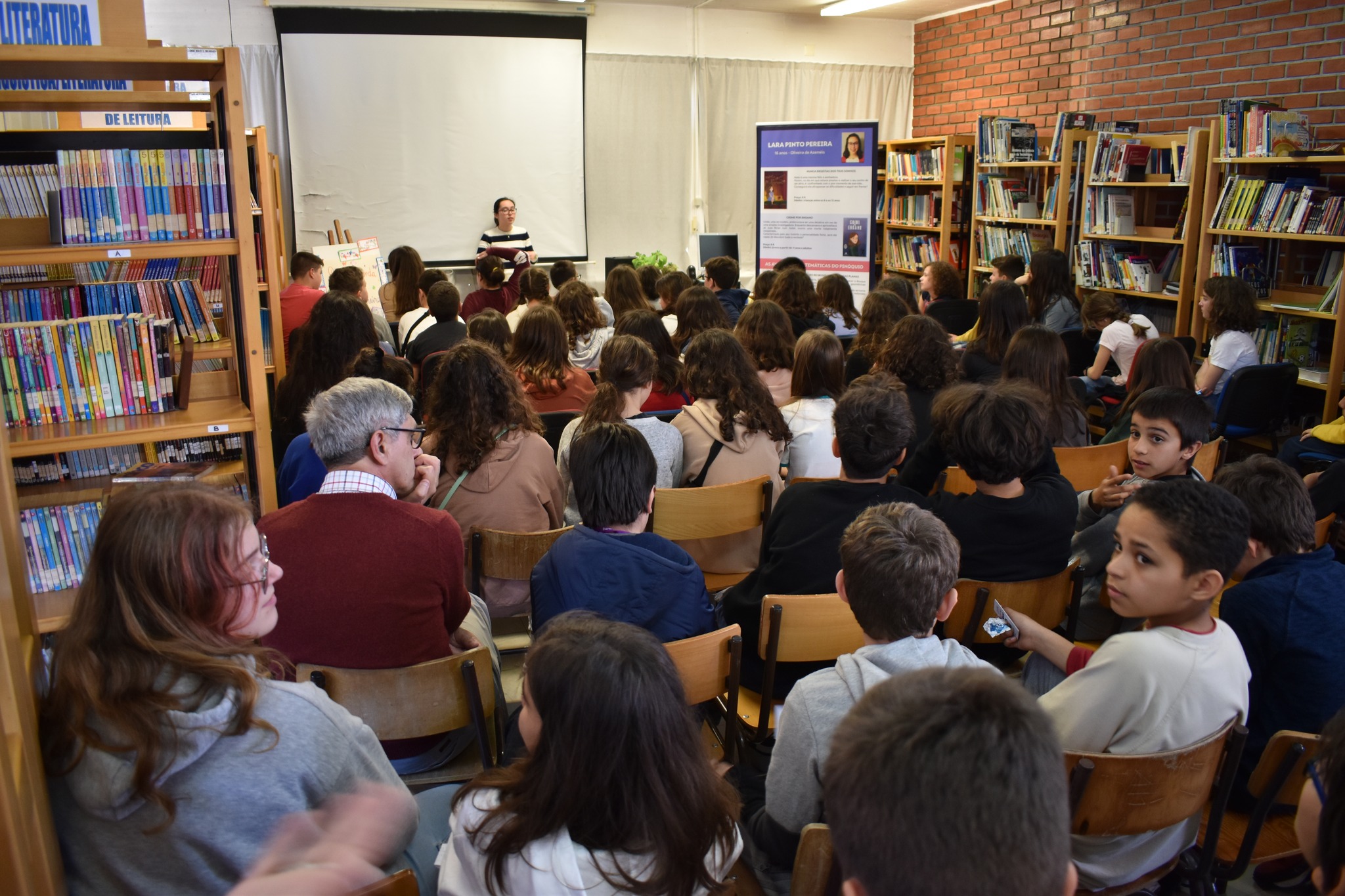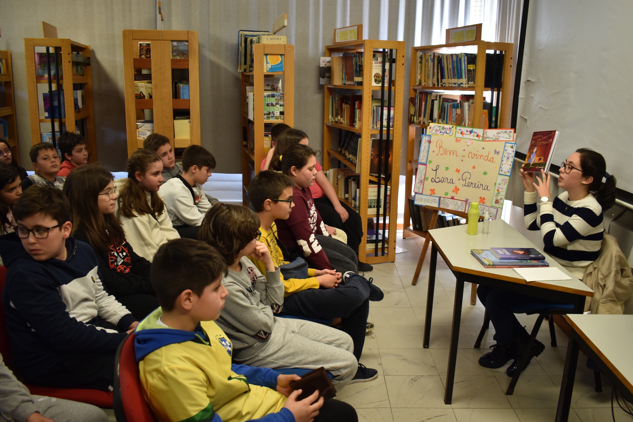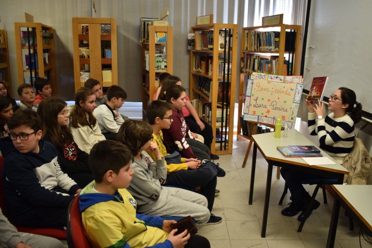 Com a Biblioteca Escolar da Escola EB 2.º Ciclo António Dias Simões, em Ovar, decorada com motivos alusivos à Primavera e elementos representando personagens em forma de figuras geométricas em que se destacavam casinhas da floresta, árvore com folhas em triângulo e uma ‘escultura’ de sólidos como resultado do trabalho de articulação entre as disciplinas de Matemática, Português, Educação Visual e a colaboração da Biblioteca Escolar, que, no passado dia 24 de março, recebeu a jovem escritora Lara Pinto Pereira coautora com Andreia Oliveira Hall da obra em dois volumes ‘As Aventuras Matemáticas do Pinóquio’ com ilustrações de Ângela Luzia, para uma sessão de apresentação dos seus livros aos alunos das turmas 5.º E, 6.º A e 6.º B da Escola EB 2.º Ciclo António Dias Simões / Agrupamento de Escolas de Ovar.